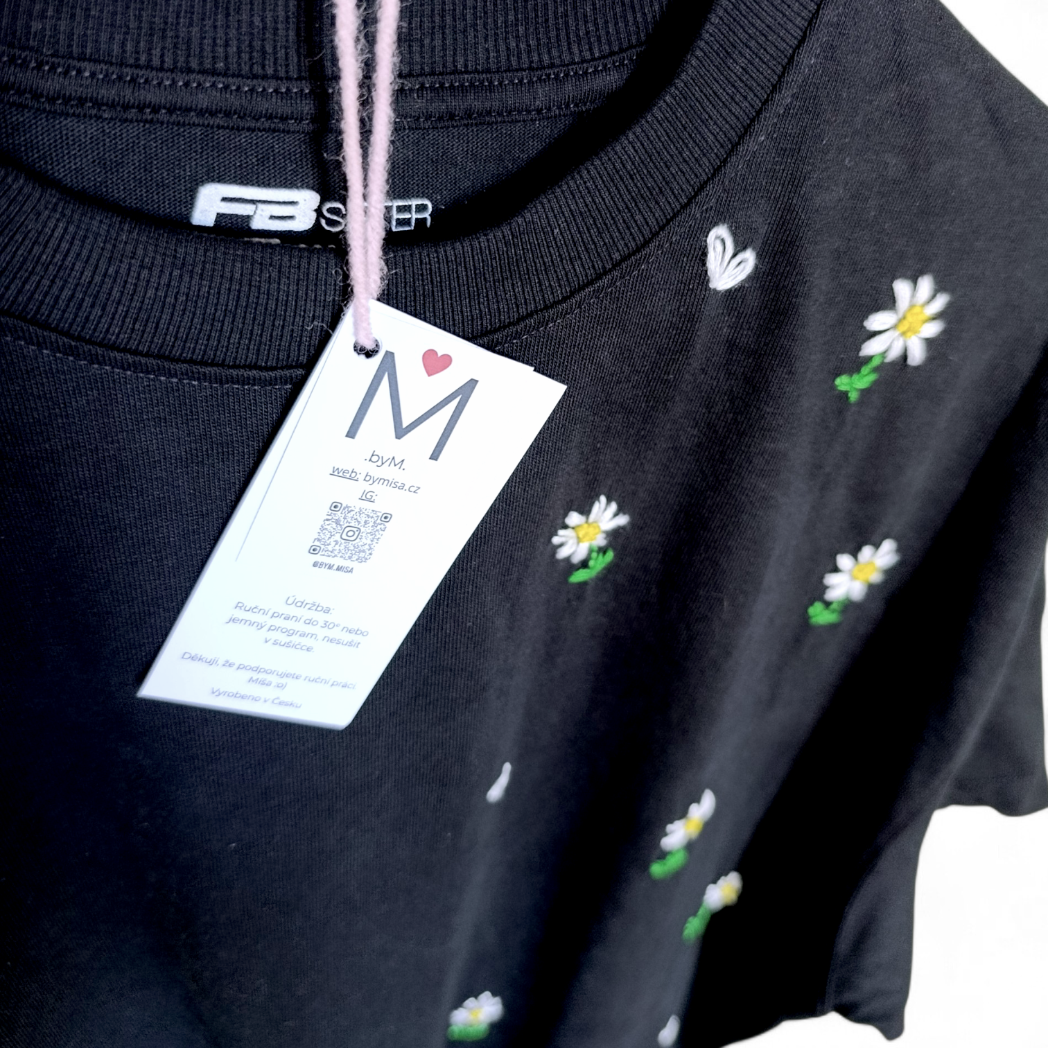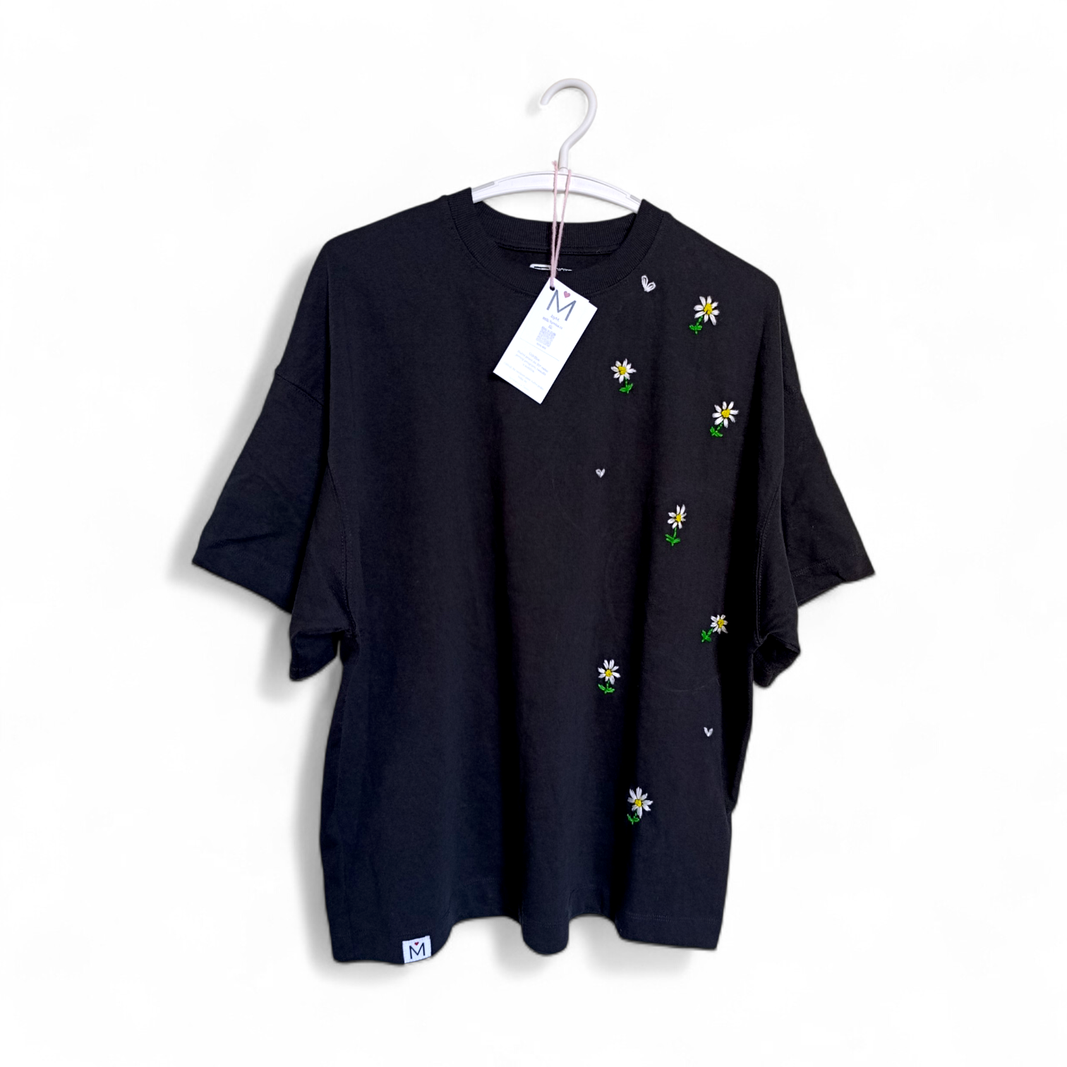Autorský kousek, který spojuje jemnost květin s kontrastem černého podkladu. Motiv ručně vyšitých kopretin doplňují drobná bílá srdíčka, která dodávají tričku něžný a osobitý charakter. Noční kopretiny působí romanticky, ale zároveň nadčasově a snadno se kombinují s každodenním outfitem.