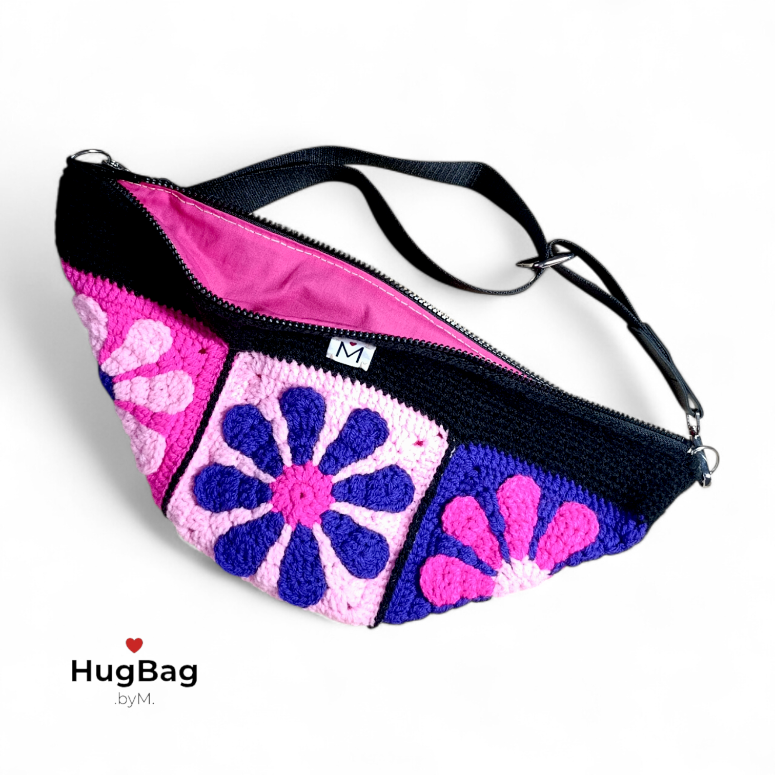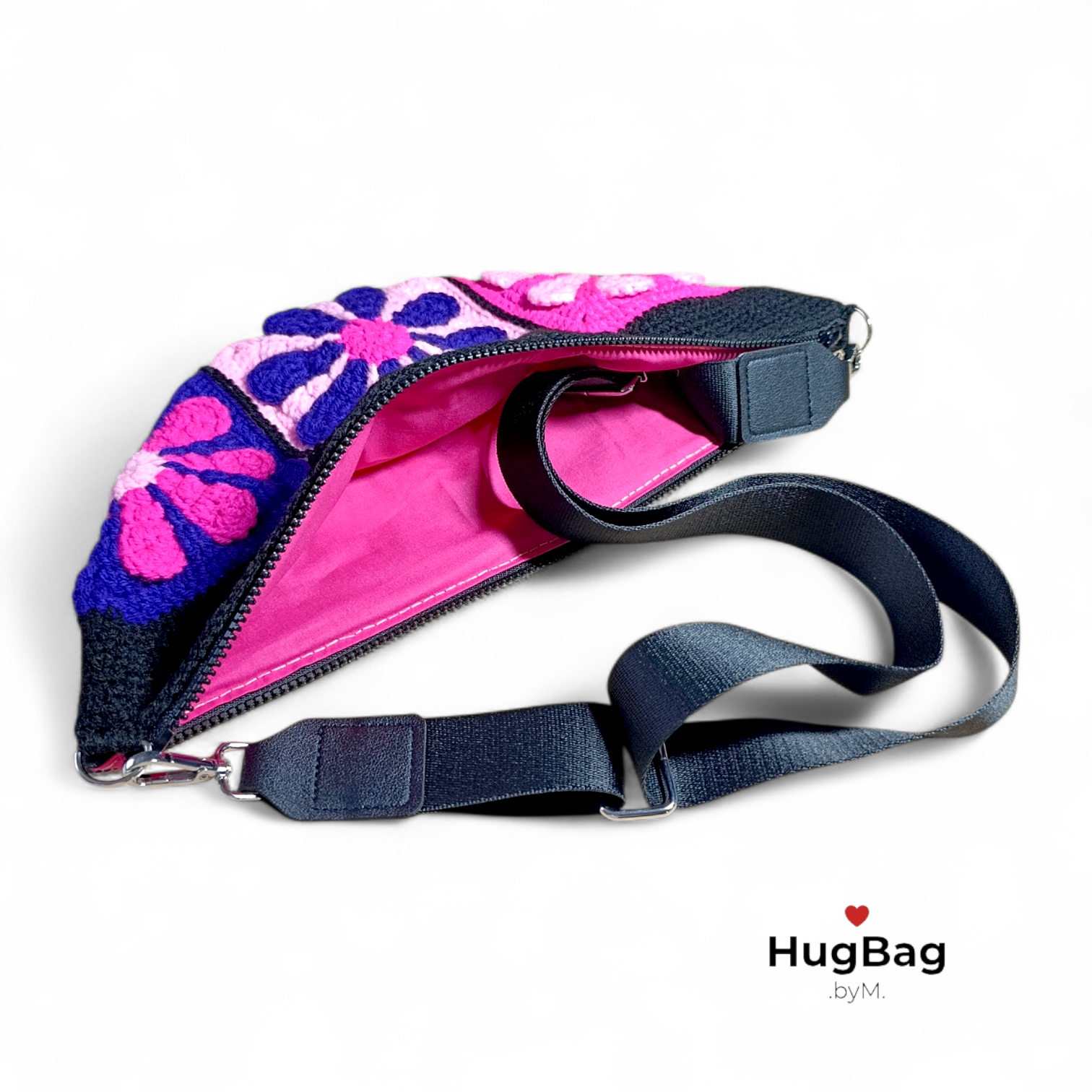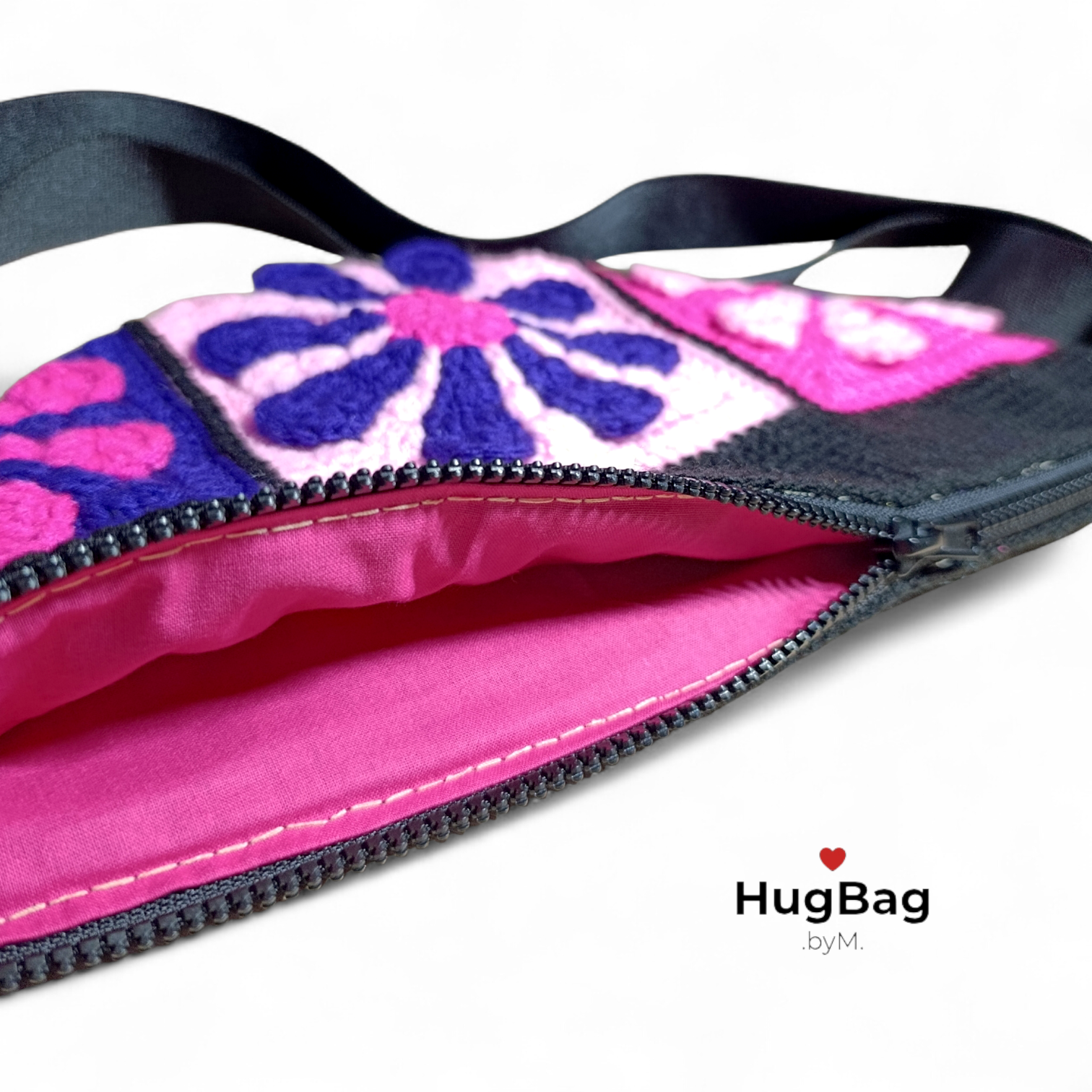 Barevná kombinace černé, fialové a dvou odstínů růžové působí živě, jemně a zároveň výrazně. Hugbag Rozkvět připomíná moment, kdy se barvy probouzí, míchají a vytvářejí harmonický celek. Ledvinka, která symbolizuje radost, ženskost a pocit, kdy se cítíš sama sebou.